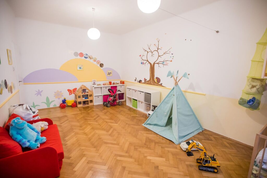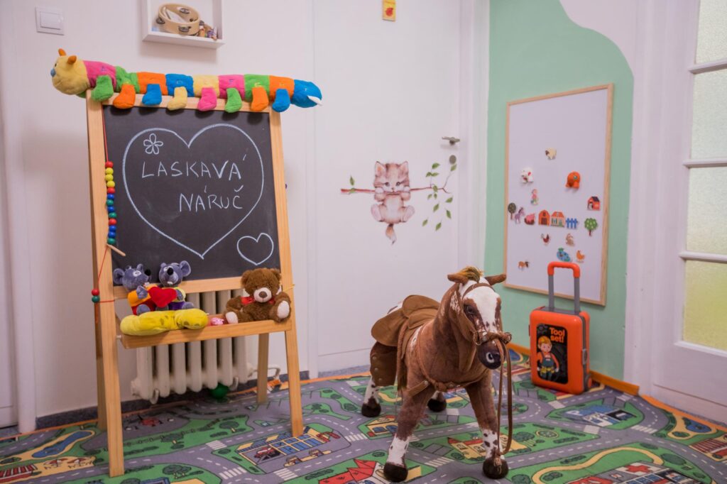 - Bezpečné prostředí – děti mají útulné prostory přizpůsobené jejich věku.